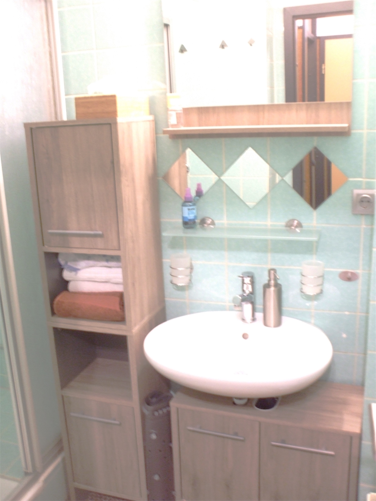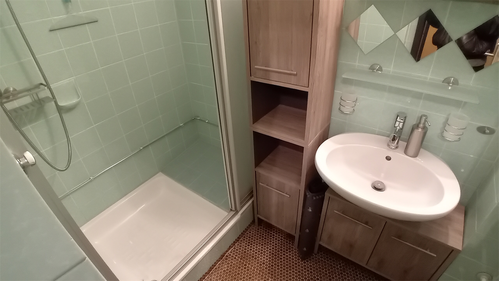 Bad und WC sind getrennt. Ablagemobiliar im Sanitärbereich ist vorhanden.
