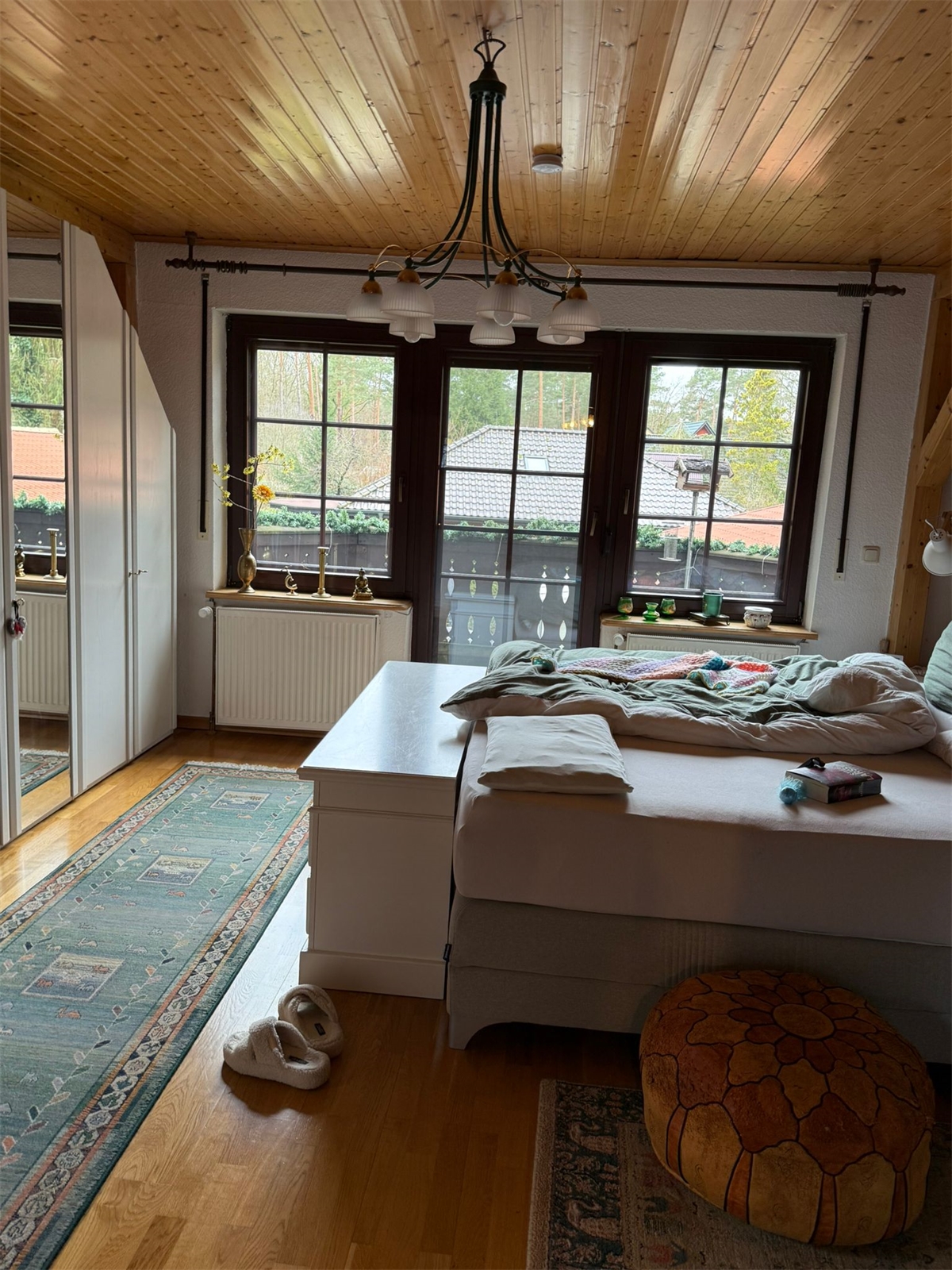 Geräumiges Schlafzimmer mit Holzverkleidung
