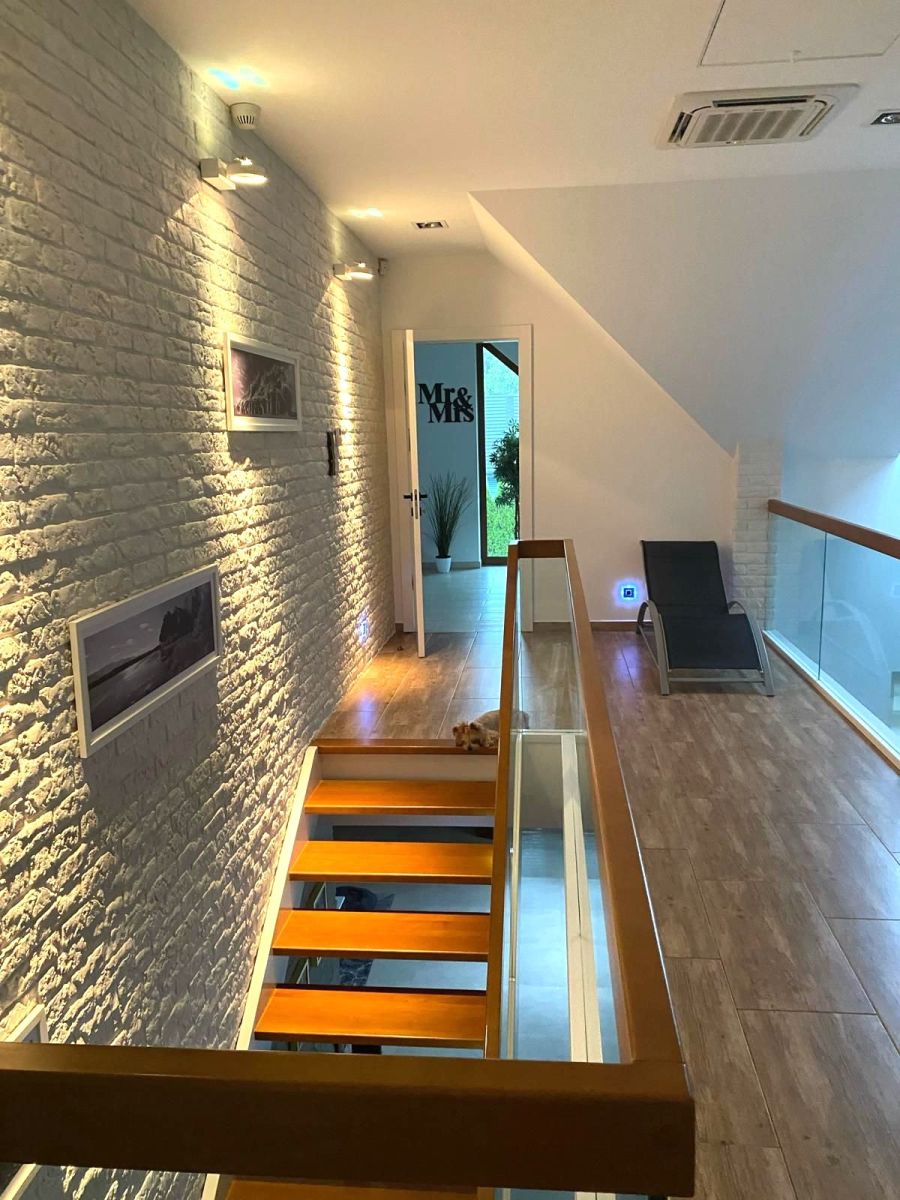 Design-Akzente wie Glasgeländer auf der Galerie, Eichenstufen, hochwertiger Feinsteinzeug, italienischer Naturstein, Parkett und elegante Jalousien schaffen einen harmonischen und luxuriösen Raum.