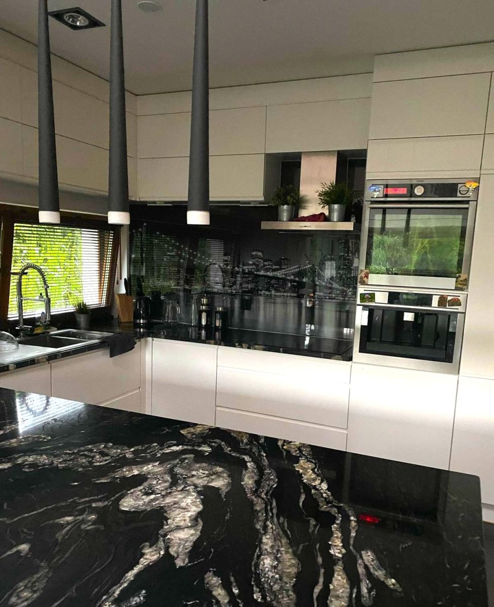 einer Küche mit Insel (6 m²), die mit dem Esszimmer (10 m²) verbunden ist – ein Traum für jeden Kochliebhaber, ausgestattet mit einem modernen Dampfofen, Induktionskochfeld, Kaffeemaschine und Unterbeleuchtung,