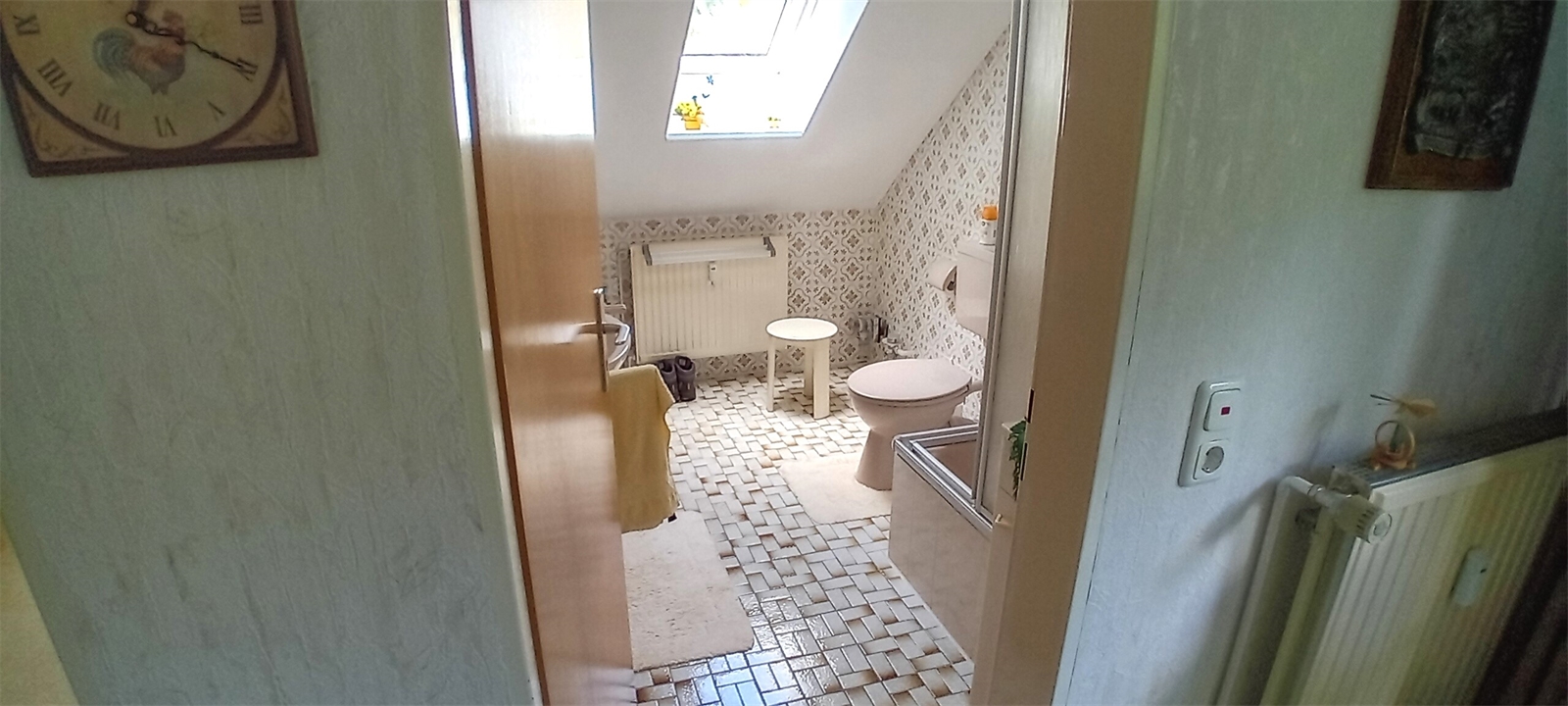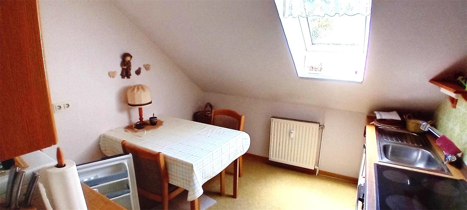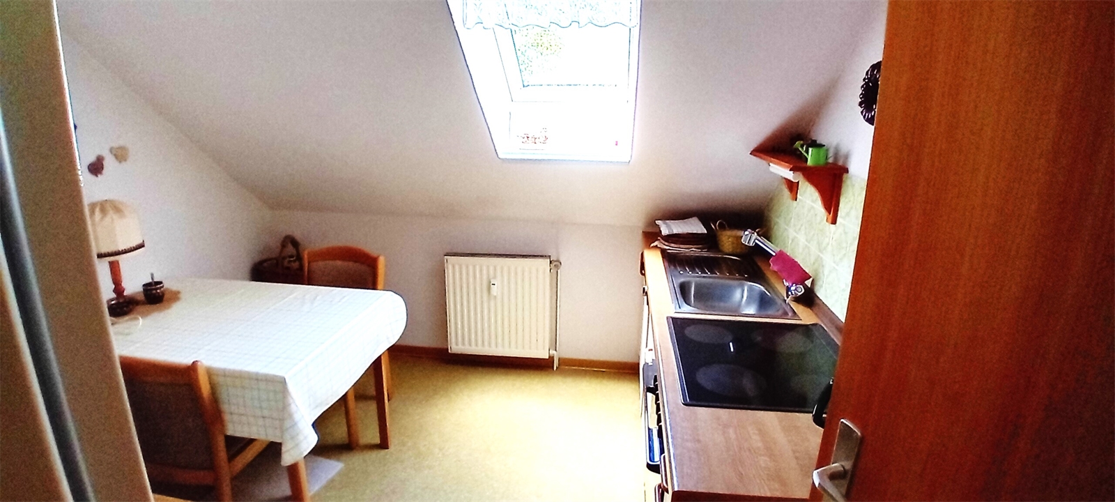 Badezimmer und Küche bieten Tageslicht, ebenfalls durch ein Dachschrägenfenster.