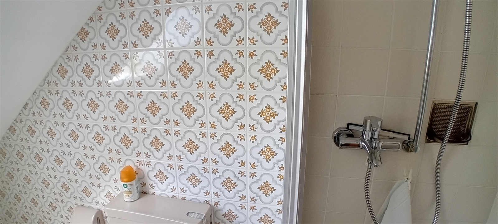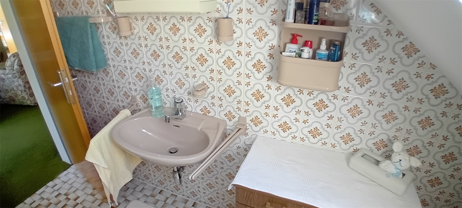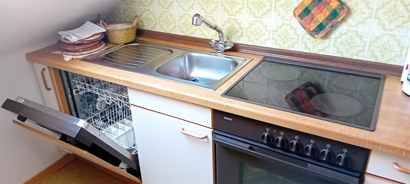 Badezimmer und Küche bieten Tageslicht, ebenfalls durch ein Dachschrägenfenster.